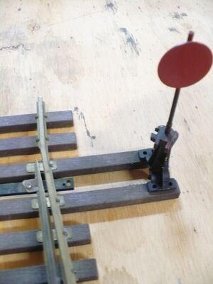 When the switch is located some distance away, it can be hard to tell if the points have activated. One solution for this problem is to mount a manual switch stand to the Head Ties and connect it to the throw rod. As the points are moved by the pneumatic motor, the throw rod will activate the switch stand, causing it to rotate in response to the change in point settings. Note: You will need to remove the manual switch stand handle as this handle also acts as a locking mechanism preventing the switch stand from following the change in switch point position.